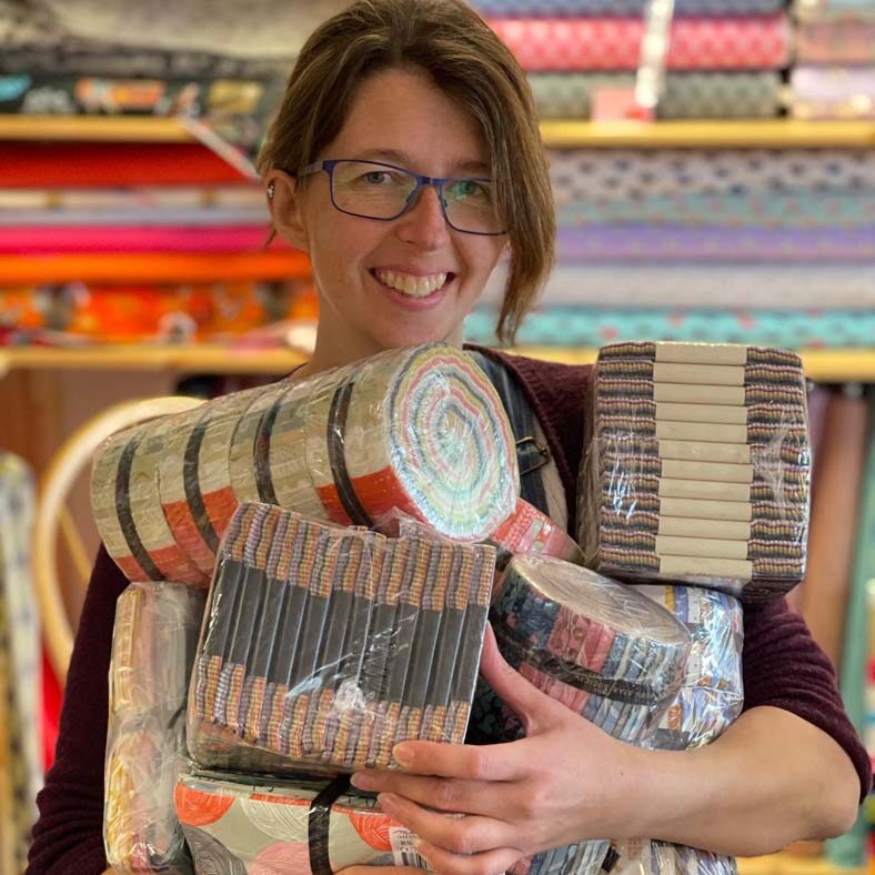 The team also includes university students Eleanor, Keasty, and Gen, who return during holidays, along with younger team members Ellie, Lydia, and Hallie who assist on weekends. Kerry keeps the shop running behind the scenes, and Hélène manages marketing and social media while also teaching quilting classes.