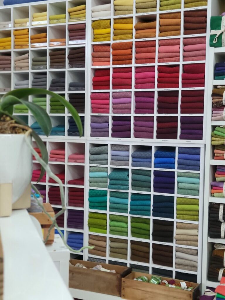 The 1,700-square-foot shop is designed as a boutique sewing and quilting space that blends traditional techniques with a fresh, design-led perspective. Fabrics and materials are curated carefully so they work beautifully together, making it easier for quilters and sewists to confidently combine colors, textures, and prints.