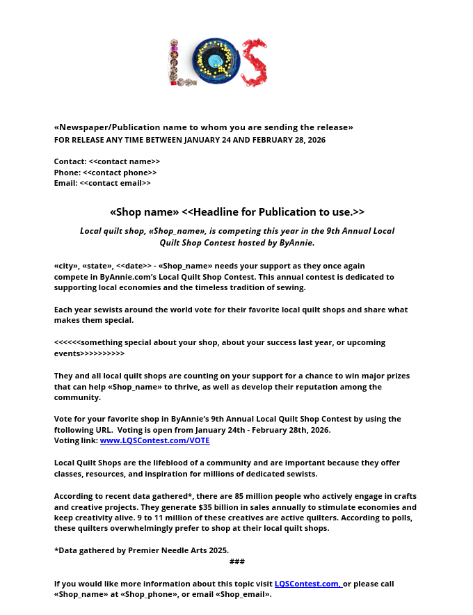 Using the following iframe code, many quilt shops can “let customers look through a window” on their own website over to the www.LQSContest.com/vote page.
